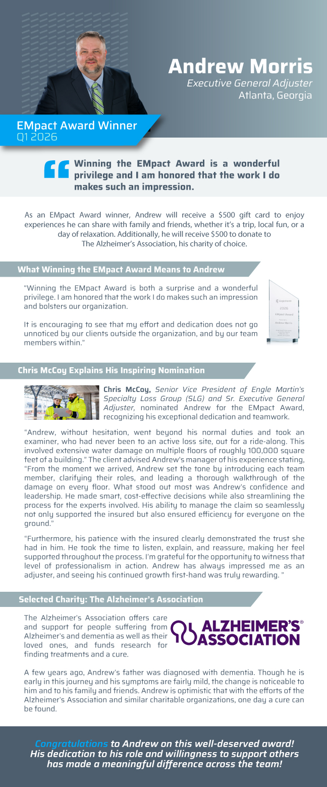 During the nomination process, Andrew’s peers stated that “Andrew’s patience with the insured clearly demonstrated the trust she had in him. He took the time to listen, explain, and reassure, making her feel supported throughout the process. I’m grateful for the opportunity to witness that level of professionalism in action. Andrew has always impressed me as an adjuster, and seeing his continued growth first-hand was truly rewarding.”