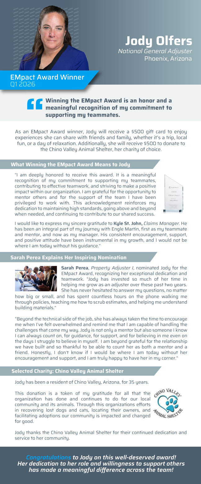 Engle Martin is excited to announce the newest winners of our EMpact Award, Andrew Morris and Jody Olfers. One of our core values is the commitment to recognize and celebrate the value of everyone’s contribution. This peer-nominated award acknowledges individual performance, leadership qualities, and positive influence to our organization.
